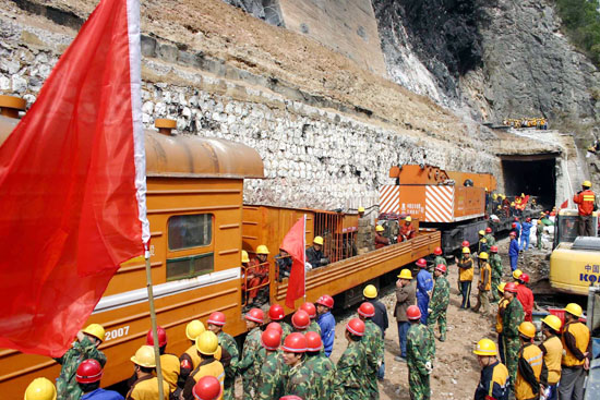 5月22日,救援列车从洞内拖出最后三节被毁车辆。当日上午10时,宝成铁路109号隧道内40节受损车辆全部被拉出,隧道贯通为恢复通车奠定了基础。(新华社记者 都红刚/摄)