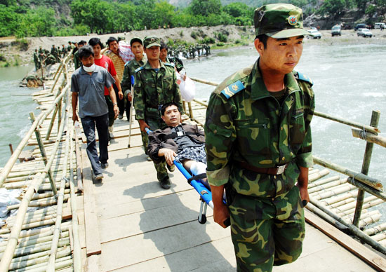 5月22日,两名解放军战士抬着当地伤员通过新架设的浮桥。在四川省绵阳市平武县南坝镇救灾一线,当地的唯一一座桥梁被震毁。解放军空降兵某部抓紧时间抢架浮桥,在3天时间内完成了桥梁的架设,极大提高了灾区救援速度。(新华社记者 黄深钢/摄)