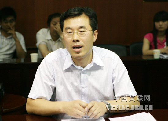 宝鸡市委常委、副市长孙毅为文艺家小分队介绍当地抗震救灾情况。中国文联网 孟祥宁 摄