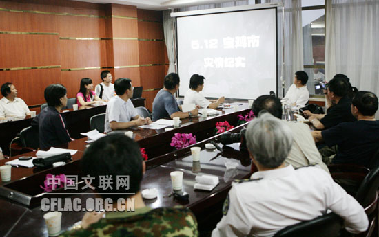 5月25日晚,文艺家小分队听取宝鸡市相关部门介绍当地抗震救灾情况。中国文联网 孟祥宁 摄