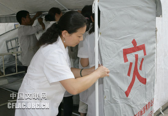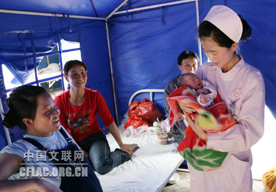 宝鸡市陈仓医院把抗震棚变成了临时病房。医院护士在照料在抗震棚里出生的新生命。中国文联网 孟祥宁 摄