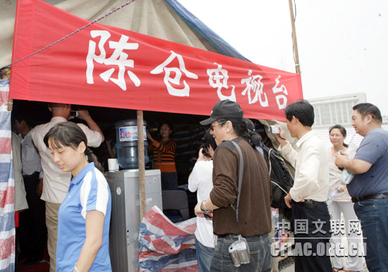 因为地震,宝鸡市陈仓电视台的办公地点成为危房,为了不影响老百姓看节目,更为了在第一时间内让当地老百姓收看政府关于防震救灾的信息,电视台干脆在抗震棚里办公。虽然条件非常简陋,但大家却热情高涨。电视台工作人员说,他们在哪里办公并不重要,重要的是如何在第一时间能够让老百姓收看到当地政府关于抗震救灾的信息,避免老百姓的恐慌。中国文联网 孟祥宁 摄