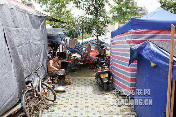 5月3中午12点20,一位正在做午饭的男子挥手向记者挥手致意。他背靠的帐篷就是江油市委宣传部和江油市文联的办公地点。中国文联网