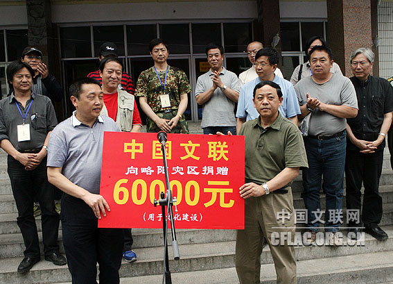 中国文联国内联络部主任夏潮向当地有关同志移交捐款。中国文联网 孟祥宁 摄