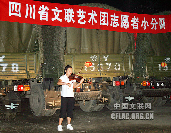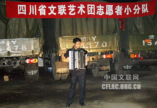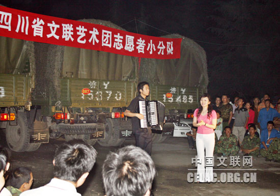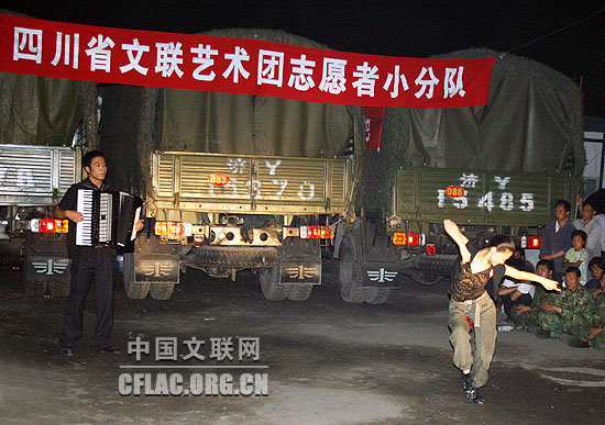 四川省文联艺术团为向“5.12”汶川大地震中,第一时间赶赴灾区,奋不顾身抗震救灾的人民解放军官兵表达崇高敬意。5月24日下午,组织了一支由10人组成的志愿者小分队前往彭州通济镇,对济南军区英雄侦察连的一百多名指战员及通济镇的受灾群众进行了慰问演出。