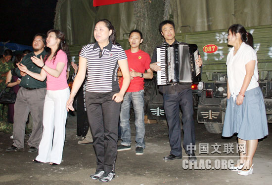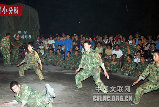 晚上八点,在救灾现场的一个稍显宽敞的地方,战士们和群众围坐在演员四周。没有灯光,就用车灯照射,没有话筒,演员们就敞开本嗓,用最真的人声在一台手风琴伴奏下,饱含深情地演唱了《我和我的祖国》、《我的士兵兄弟》、《为了谁》、《真心英雄》等数首歌曲。常常是演员们开个头,战士们就跟着唱起来,分不清谁是演员谁是观众。尽管十多天的"士兵突击"让战士们相当疲惫,官兵们还是用沙哑充血的喉咙"吼"出了对灾区人民的一片深情,歌声在漆黑的帐篷内外飘飞……女声独唱、男女声重唱、四人小合唱、小提琴独奏、诗朗诵,演出在澎湃的激情中进行。当《精忠报国》的歌声响起,战士们再也按奈不住,也起身表演了一段阳刚果敢、难度系数颇高的擒敌操。当诗歌朗诵《我有一个强大的祖国》,四位演员每每读到"那一刻,我感到--我有一个强大的祖国"时,台下掌声雷动,一股爱国的情愫在每一个人的心中涌动。