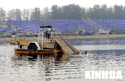 奥林匹克水上公园的工作人员用专用设备在静水赛道上做清污处理(5月20日摄)。 新华社记者王颂摄