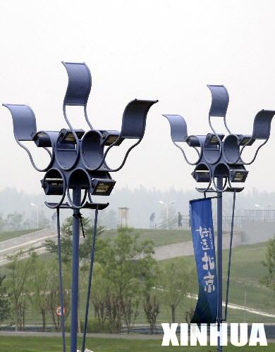 安装在奥林匹克水上公园内的太阳能路灯(5月20日摄)。 新华社记者王颂摄
