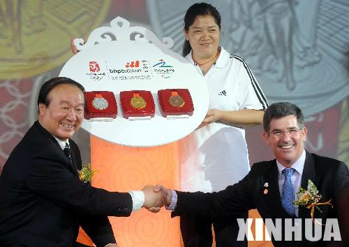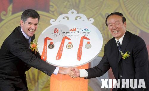 7月3日,必和必拓中国区总裁戴坚定向北京奥组委执行副主席蒋效愚交付北京2008年奥运会奖牌。当日,北京2008年奥运会及残奥会多元化矿物及奖牌赞助商必和必拓向北京奥组委交付了2008年奥运会及残奥会所需的共计6000枚金、银、铜牌。奖牌制作所需的原材料分别从智利和澳大利亚运抵中国,并由上海造币厂完成制作。