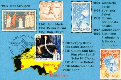 在各国集邮组织制作的奥运火炬接力专题邮品中,点燃奥运圣火也成为了重要的主题。在2000年悉尼奥运会期间,澳大利亚的有关集邮组织曾发行过一枚特殊的明信片,上面印有点燃各届奥运圣火人的名字,同时印上了有关的奥运邮票,并贴上澳大利亚邮政为2000年悉尼奥运会发行的邮票并加盖了纪念邮戳。(上图)