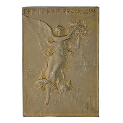奖牌正面为张着双翅的胜利女神双臂上举,双手托着月桂花冠。背景图案为巴黎景色和世界博览会纪念物。