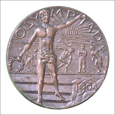 奖牌正面为一名运动员站在台阶上,右手拿着一簇月桂花冠,象征着胜利,左手高高举起。背景图案为浅浮雕,展示古代体育竞赛分项,浮雕后面是一座希腊神庙。运动员图像上面印有“奥林匹亚”字样,右下角注有年份“1904”。