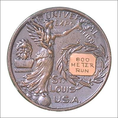 奖牌背面为希腊胜利女神奈基站在地球上。她左手举着月桂花冠,右手拿着棕榈叶。她的前面是一个大花冠,里面写有各个竞赛分项的名称;后面是一尊放置在柱基上的宙斯半身像。牌面题有“美国圣路易斯世界博览会”字样。