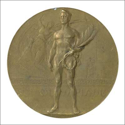 奖牌正面为一名高个儿裸体运动员。他左手拿着象征胜利的棕榈叶和月桂花冠。在他的身后是吹着喇叭的信息女神像。