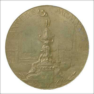 奖牌背面是为纪念名叫巴拉沃的勇士而设立的安特卫普纪念碑,背景是安特卫普大教堂和港口;顶部刻有“ANVERS MCMXX”字样,意为安特卫普1920。