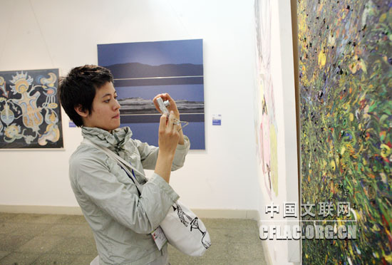 7月9日下午,第三届中国北京国际美术双年展分场馆展览在中央美术学院陈列馆开幕。图为一名观众在拍摄参展作品。中国文联网孟祥宁 摄