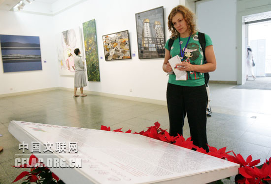 7月9日下午,第三届中国北京国际美术双年展分场馆展览在中央美术学院陈列馆开幕。图为一名外国观众在观看展览前言。中国文联网 孟祥宁 摄