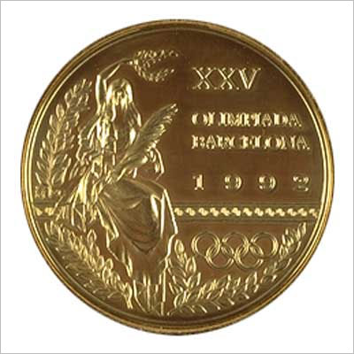 奖牌正面是一个直径55毫米的圆形图案,上面刻着带有现代风格的胜利女神奈基的形象,并刻有“1992年第25届巴塞罗那奥运会”字样。