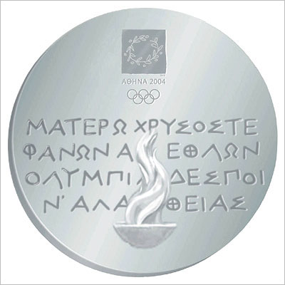 奖牌背面图案共有3个成分:在奥林匹亚点燃并在2004年火炬传递中穿越五大洲、熊熊燃烧着的圣火;古希腊诗人品达公元前460年创作的奥林匹亚颂的头几行诗;2004年雅典奥运会会徽。