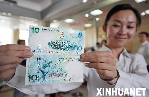 7月9日,市民在银川市一家中国银行营业点展示刚兑换到的奥运纪念钞。 当日,银川市开始向社会办理奥运纪念钞兑换发行工作。