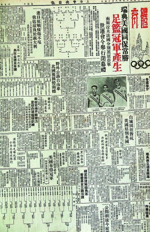 图为1948年8月14日《中央日报》第五版(即上海版),整版报道第十四届奥运会情况。