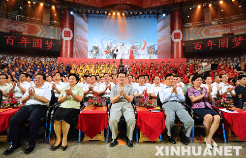 《百年圆梦——迎2008北京奥运会文艺晚会》在京举行 李长春等出席观看 7月29日,《百年圆梦——迎2008北京奥运会文艺晚会》在北京举行,中共中央政治局常委李长春出席并观看。 新华社记者 李涛 摄