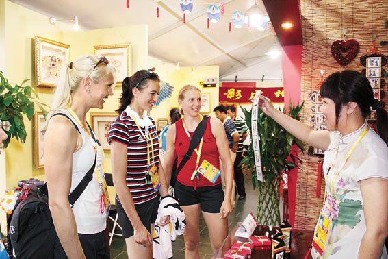 散发着迷人魅力的中国民族民间手工艺制作及展示活动吸引了大量的外国友人,展区内每天都是人头攒动,热闹非凡。大家看到了中华文化对世界的影响力、吸引力,也见证了中国同世界各国人民的友谊。在展示区的一隅,陕西华县皮影艺术家和北京皮影剧团轮番献演《卖货郎》、《三打白骨精》、《龟与鹤》等经典节目。来自马其顿的100米自由泳选手伊莲娜·波波卡观看了华县皮影《卖货郎》后,感叹道:“太神奇了!”巴西体操运动员戴尼尔·海波立特对《卖货郎》十分陶醉。他说:“虽然我不是很明白故事大意,但非常喜欢这场演出,尤其是音乐。”来自陕西的皮影艺术家姜建合怀抱月琴为皮影表演伴唱,同样引起了戴尼尔·海波立特的浓厚兴趣。表演结束后,戴尼尔在艺术家手把手的指导下,体验了一把皮影表演。他感慨地说:“太难了,总觉得手指不够用。”古巴女子排球队功勋教练欧亨·尼奥对北京面塑艺术家张俊显为他孙子制作的面塑特别满意,之后又拿出自己已故去15年的夫人年轻时的照片,请张俊显参考再做一个面塑。美国男子水球队教练称“泥人张”第五代传承人张宏岳是最棒的艺术家,他拿出一只皮球在展厅摆出投掷水球的招牌式动作,请张宏岳拍下照片,并按照片定制泥塑。刚过了一天,他又来到展厅,从包里拿出自己女儿的照片,希望再定做一件。