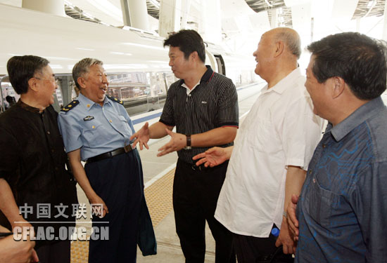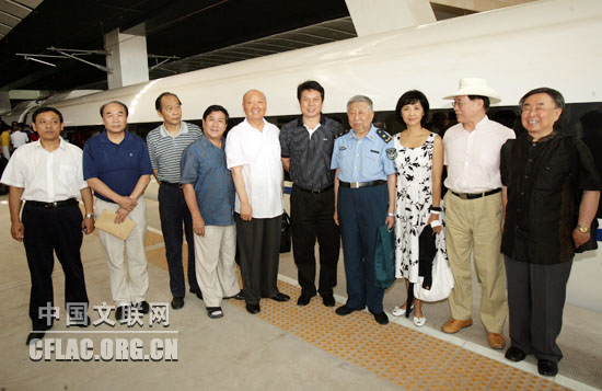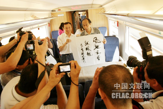 | 以300多公里的时速,在半个小时内从北京直抵天津,这样的速度让艺术家们赞叹不已。7月6日,作为“放眼企业看巨变——纪念改革开放30周年千名文艺工作者专题采风活动”的一项重要内容,由中国文联组织的京津城际铁路考察采风团一行亲身体验了现代科技带来的快捷和舒适,见证了祖国在现代化道路上取得的新成就。中国文联党组副书记、副主席覃志刚,铁道部政治部宣传部部长、新闻发言人王勇平,中国文联国内联络部主任夏潮以及吴雁泽、吕厚民、阎肃、韩作荣、雷抒雁、孙德全、林莽、张志宽、朱琳、韩浩月、杨梅、耿国彪、蓝野、李浩等著名艺术家参加了此次采风活动。 7月6日上午9时,采风团一行乘坐CRH3“和谐号”动车组列车从北京南站出发,开始了考察之旅。一进列车,宽敞明净的车厢和宽大舒适的座椅就引起了人们的赞叹。采风团成员按捺不住好奇,在车厢内走来走去,仔细观察。不知不觉中,列车时速已平稳升至300多公里。吴雁泽指着桌子上的一杯水对记者说:“你看它始终一动不动,就知道列车行驶得多么平稳,中国有这样舒适、环保、科技含量高的列车,让我感到自豪。”吕厚民同样为此感到自豪,他说:“几乎感觉不到晃动,也没有晕眩的感觉,很让人惊叹。” 列车行进至京郊,透过车窗,可见盛夏北方的原野晴朗开阔、绿意正浓,列车疾驰而过,令人更觉心旷神怡。雷抒雁一直凭窗而坐,欣赏窗外的景色,他对记者说:“在这么高速行驶的列车上,看外面的景色仍然有一种沉静的美,这样的速度提升是人性化的。这也是改革开放30年来中国综合国力提升的一个具体体现。”在此之前,阎肃还以为列车采用的是磁悬浮技术,在听了铁道部同志的介绍后他很感慨:“原来这是我国第一条具有自主知识产权和国际一流水平的高速城际铁路,是为2008年北京奥运会服务的重点工程项目,开创了我国铁路建设史上的多项‘第一’,中国科技真牛!”列车于9点30分到达天津,整个旅途中,朱琳为见证了这条铁路的开通感到兴奋。她说,等到8月1日京津城际铁路正式开通之后,还要坐这辆列车去天津会晤一位朋友,“怀着全新的心情坐全新的列车,去赴一次全新的约会!”中国铁路文工团舞蹈编导杨梅此前刚刚创作了舞蹈《快乐的风》,反映的就是中国铁路的变化,此次采风她更有感触:“作为铁路人我感到自豪,我要创作更多更好的作品,把中国铁路的新成就展现给大家。” 采风团一行兴致都很高,在疾驰的列车上还举行了一次小型书法笔会。覃志刚写下“飞龙”二字,王勇平写下“龙腾京津”,夏潮写下“天路”,众多艺术家也纷纷参与进来,用笔墨来表达自己的亲身感受。采风活动的最后,铁道部副总工程师郑健向大家介绍了京津城际铁路及北京南站的建设情况。 覃志刚在接受记者采访时说,在迎来改革开放30周年之际,中国文联组织文艺家深入基层企业和一系列国家重点建设工程,实地了解和感受产业系统30年来发生的巨大变化,根本目的是为了通过采风促进创作,热情讴歌改革开放的伟大成就,充分展示亿万产业职工的昂扬风采,表达我们在新形势下全面贯彻落实科学发展观,毫不动摇地坚持改革开放,把中国特色社会主义伟大事业不断推向前进的决心和信心。