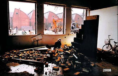 其中一张照片展示了798工厂过去的样子——红砖砌成的厂房宽敞空旷、平淡乏味、千篇一律。 照片中一个工人在做翻修工作。他的劳动成果在另一张照片中可以看到,这也就是翻新之后的798工厂。如今,随着大部分乏味的工业车间和办公间转型成为画廊和创意工作室,798也成为了北京的艺术家、艺术品经销商、艺术爱好者乃至游客最喜欢光顾的一个地点。 眼下798也许保留了计划经济时代军工建筑的部分风格,不过它现在的样子让人很难联想到其鲜为人知的过去。 在798被翻修一新的一排排房子中,座落着年轻艺术家经营的小型公司和画廊。他们在这里举办展览、承担设计合同。同时为了增添几分生机,他们还销售进口的和国产的艺术书刊,也发行杂志。在这些公司和画廊周围,是一家又一家的咖啡屋。 从表面上看,北京798工厂的转型不过是市场经济时代的一个偶然。一帮勇于创新而又愿意实践的人,有幸碰到了宽容的城市规划者。这些规划者没有派人在这些旧房子和旧工厂的墙上写上大大的白色“拆”字。 每个城市中心都应该给艺术家圈子留下蓬勃发展的空间,以吸引更多国内外人才。 然而在中国城市里,一些自命不凡的官员们只会向访客炫耀光芒四射的办公大楼和宏伟庞大但却往往空无一人的投资商圈,吹嘘其如何在几年之内将城市变成了现代金融中心。然而实际上只有北京和上海才能为艺术家和其他富有创造力的专业人士提供独特的、充满活力的场所。 北京798的以上两张照片生动地说明,对于任何城市来说,计划经济和市场经济最基本的区别并不在于其建筑外观如何,也不在于这些建筑价值几何,而是要看这座城市所蕴含的思想。(摄影记者:王文澜) |