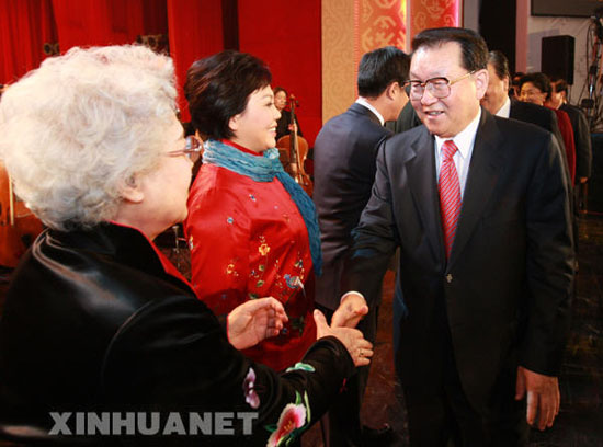 12月10日晚,“春天的故事——大型交响合唱朗诵晚会”在北京民族文化宫大剧院举行。中共中央政治局常委李长春与首都各界群众一同观看演出。这是晚会结束后,李长春与演职人员握手。新华社记者 庞兴雷 摄