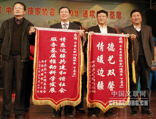 12月20日至21日,由中国文联、中国杂协、新疆生产建设兵团党委宣传部、新疆生产建设兵团文联主办,新疆生产建设兵团农十三师承办的“送欢乐、下基层”慰问演出活动在新疆哈密举行,70多位艺术家为屯垦戍边的农十三师广大职工群众送上了精彩的文艺节目。图为新疆生产建设兵团农十三师向演出队伍赠送锦旗,李牧、林建接受锦旗。中国文联网 郑荣健 摄