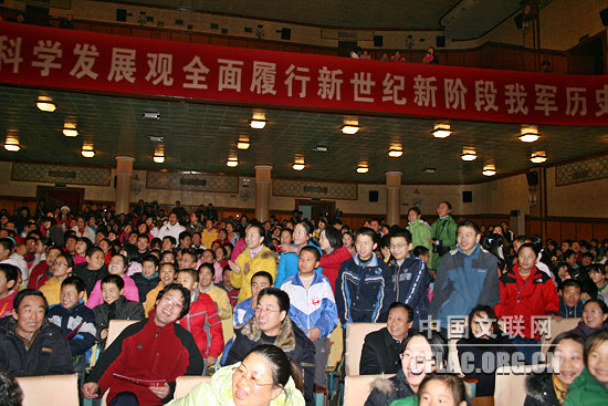 12月25日中国文联、中国曲协赴酒泉卫星发射中心慰问演。图为酒泉卫星发射基地东风剧场内艺术家的表演让观众乐开了怀。中国文联网 金涛 摄