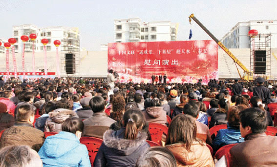 激情荡漾,用艺术温暖人心;歌舞飞扬,把精品献给百姓。12月29日下午,甘肃天水市秦安县两万多名父老乡亲聚集在秦安体育场里,享受着中国文联“送欢乐、下基层”慰问团带来的精彩。地域特色浓郁的《秦安蜡花舞》一亮相便激起观众的情感共鸣。文欣唱起暖融融的《万家福》走进观众中,武警战士们敬起军礼对她微笑;李彦培在观众中表演的川剧变脸,让观众啧啧称奇,情不自禁地追随着他跑;宋德全、王玉的相声《姓名学》、艾来提·艾则孜的杂技《手技》、黄华丽的歌曲《山丹丹开花红艳艳》……无不赢得掌声阵阵,喝彩连连。