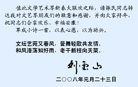 在“百花迎春——中国文学艺术界春节大联欢”举办之际,中共中央政治局委员、书记处书记、中宣部部长刘云山致信中国文联党组书记、副主席胡振民,转达他对文艺界朋友们的敬意和感谢,并赋诗一首向大家拜年。全文如下: