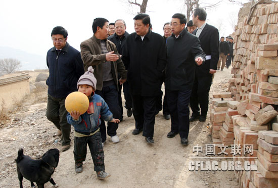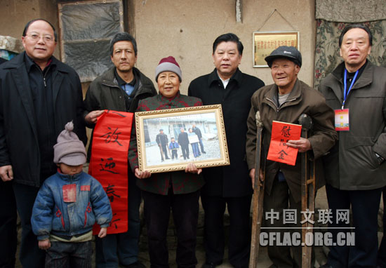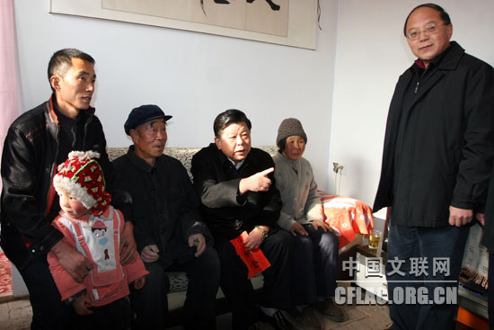 中国文联党组书记、副主席胡振民带领艺术家到天水市秦州区冯家山村困难户李根义家慰问。中国文联网 余宁 摄