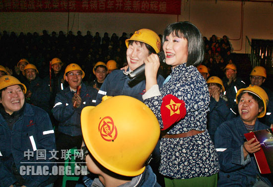 1月5日、6日,在中国剧协分党组书记董伟的带领下,中国文联、中国剧协“送欢乐、下基层”梅花奖艺术团在新春到来之际来到范各庄矿和唐山矿,为煤矿工人们送上了新年的祝福。图为王红丽和矿工兄弟同台表演豫剧《抬花轿》。高扬 摄