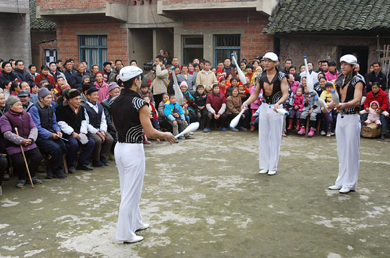1月8日下午,精彩的杂技节目走进涪陵区李渡龙桥村院坝,让农民朋友眼花缭乱。