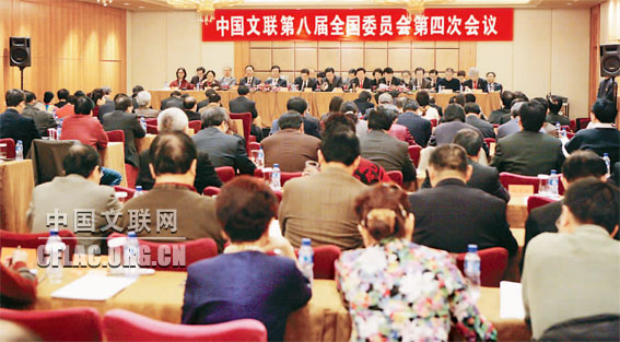 1月11日至12日,中国文联第八届全国委员会第四次会议在京召开。全国政协副主席、中国文联主席孙家正,中国文联党组书记、副主席胡振民,中宣部副部长焦利,中国文联党组副书记、副主席覃志刚、李牧,党组成员、副主席冯远、杨志今,党组成员、书记处书记廖奔、白庚胜,中宣部文艺局局长杨新贵,中国文联副主席丁荫楠、才旦卓玛、丹增、白淑湘、刘大为、刘兰芳、李维康、吴雁泽、张西南、陈晓光、段成桂、夏菊花、裴艳玲和主席团委员,以及中组部、中宣部有关负责人出席了开幕式。中国文联各文艺家协会、各直属单位、机关各部室负责人和15个副省级城市文联主要负责人列席会议。