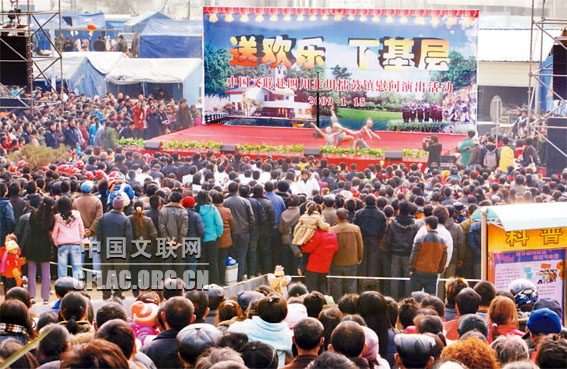 1月14日至15日,中国文联组织文艺家奔赴四川地震灾区绵竹市和北川县,举行“送欢乐、下基层”慰问演出活动。慰问演出队伍由中国文联党组书记、副主席胡振民,党组副书记、副主席覃志刚带队,中国民协分党组书记罗杨、中国书协分党组书记赵长青、中国文联国内联络部主任夏潮、四川省文联党组书记黄启国、中国摄协分党组副书记王郑生、中国杂协分党组副书记邵学敏以及尚长荣、关牧村、邓玉华、郑咏、吕薇、霍勇、金波、王小燕、刘全和、刘全利、常贵田、王佩元、乔天富、吴震启、张继等一大批知名文艺家参加。
