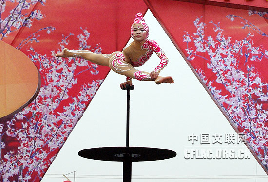 1月14日至15日,中国文联组织文艺家奔赴四川地震灾区绵竹市和北川县,举行“送欢乐、下基层”慰问演出活动。图为重庆杂技团带来杂技表演《感——倒立组合》。邓风