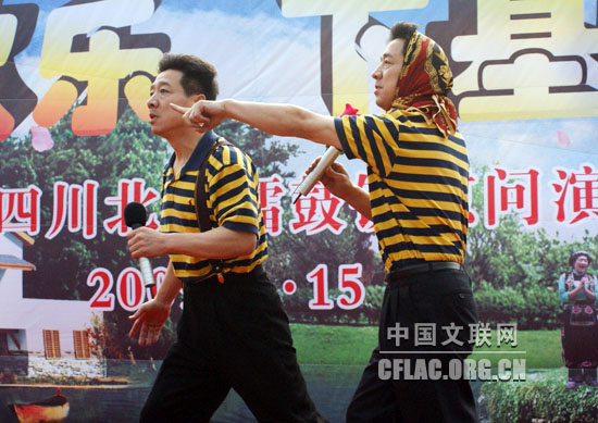 1月14日至15日,中国文联组织文艺家奔赴四川地震灾区绵竹市和北川县,举行“送欢乐、下基层”慰问演出活动。图为刘全和、刘全利表演小品《小鸟与蜜蜂》。中国文联网
