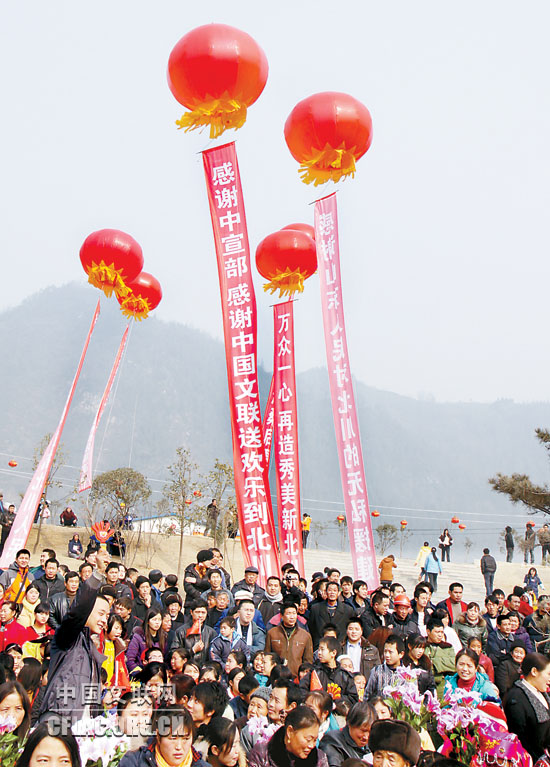 1月14日至15日,中国文联组织文艺家奔赴四川地震灾区绵竹市和北川县,举行“送欢乐、下基层”慰问演出活动。图为北川县擂鼓镇群众打出条幅感谢中宣部、中国文联。苗鸿 摄