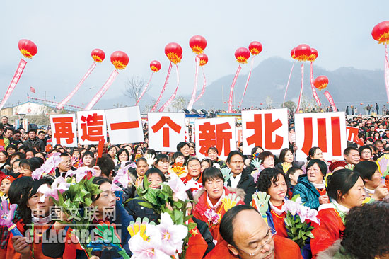 1月14日至15日,中国文联组织文艺家奔赴四川地震灾区绵竹市和北川县,举行“送欢乐、下基层”慰问演出活动。图为北川县擂鼓镇群众打出“再造一个新北川”的豪迈标语。中国文联网 康伟 摄