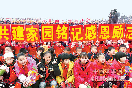 1月14日至15日,中国文联组织文艺家奔赴四川地震灾区绵竹市和北川县,举行“送欢乐、下基层”慰问演出活动。图为绵竹孩子举起标语向全国人民表示感谢。苗鸿 摄 |