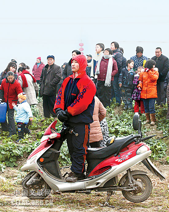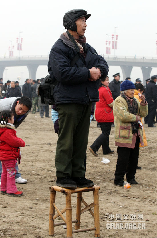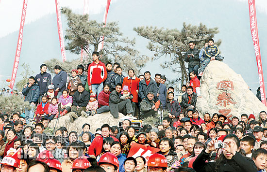 1月14日至15日,中国文联组织文艺家奔赴四川地震灾区绵竹市和北川县,举行“送欢乐、下基层”慰问演出活动。图为北川县擂鼓镇群众爬上山石看演出。中国文联网 康伟 摄