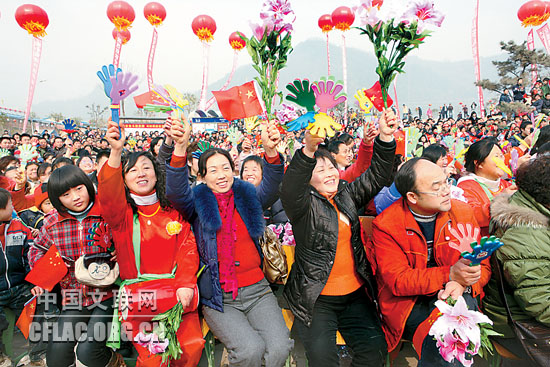 1月14日至15日,中国文联组织文艺家奔赴四川地震灾区绵竹市和北川县,举行“送欢乐、下基层”慰问演出活动。图为演出受到北川县擂鼓镇群众热烈欢迎。中国文联网 康伟 摄