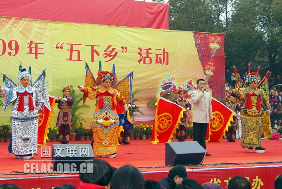 近日,由中共湖南省委宣传部牵头开展的理论、法律政策、文化、科技、卫生计生“五下乡”活动启动式在衡东县新塘镇欧阳海村隆重举行。湖南省文联积极组织艺术家参与这一活动,派出了由省文联副主席、省书法家协会主席何满宗带队的小分队。省书法家协会驻会副主席陈羲明与林乐伦、冷柏青、杨宝琳、余庭良、易任根、刘宜民等书法家为当地群众书写春联100多副,受到老百姓的热烈欢迎。省曲艺家协会副主席、笑星周卫星与搭档原野表演的相声《说一不二》掀起了文艺演出的高潮,受到观众好评。