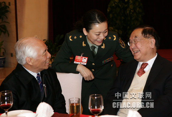 3月2日,中国文联在京举办文艺界全国人大代表全国政协委员联谊会暨中国文联“送欢乐、下基层”活动表彰会。图为周巍峙(右)、吴祖强(左)、刘敏交谈。中国文联网 孟祥宁 摄 |