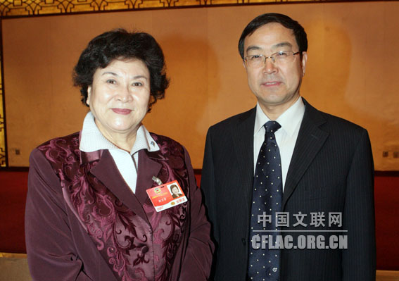 3月2日,中国文联在京举办文艺界全国人大代表全国政协委员联谊会暨中国文联“送欢乐、下基层”活动表彰会。图为中宣部副部长焦利和刘兰芳合影。中国文联网 孟祥宁 摄 |