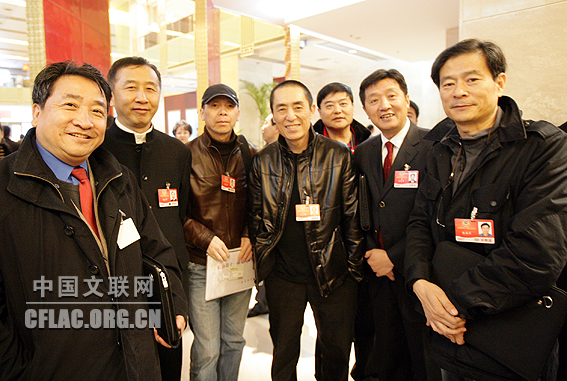3月3日,中国人民政治协商会议第十一届全国委员会第二次会议在北京人民大会堂开幕。图为姜昆、冯小宁、冯小刚、张艺谋、张会军、陈国星等政协委员合影。中国文联网 孟祥宁 摄 |